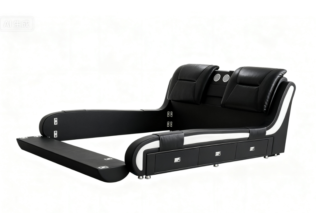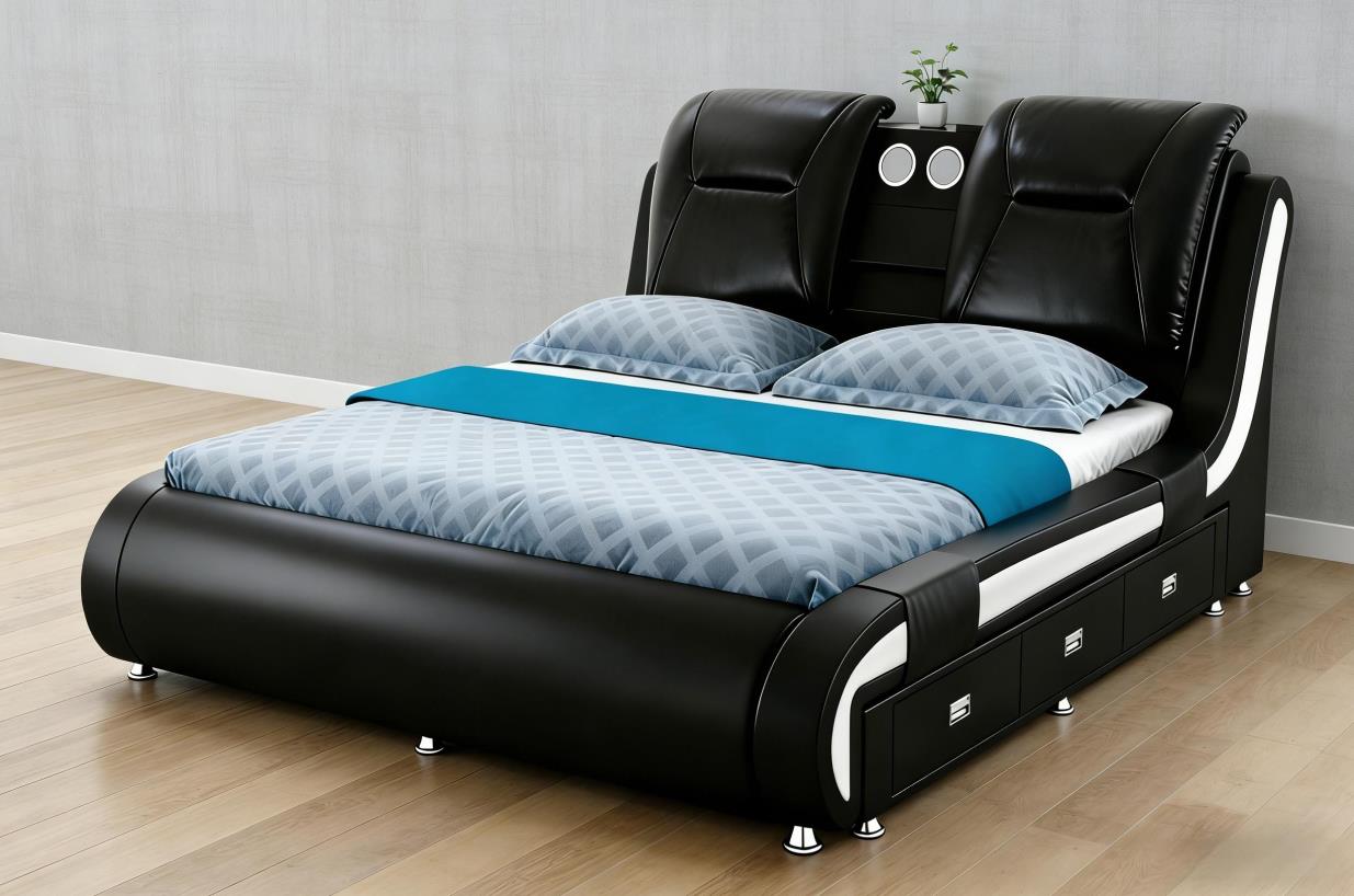 bed[153*203cm][(带抽屉+蓝牙音箱)]【主色黑色配白色】,抽屉方向是躺下在左边,黑色用018-15皮色,白色用样板的白色