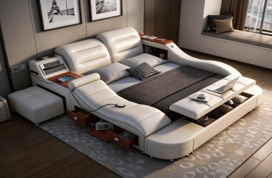 | Spec: | 183*203cm,投影仪+空气净化器+蓝雅音响+电动按摩+保险柜+USB充电+双抽储物+储物侧边柜+床尾凳 |